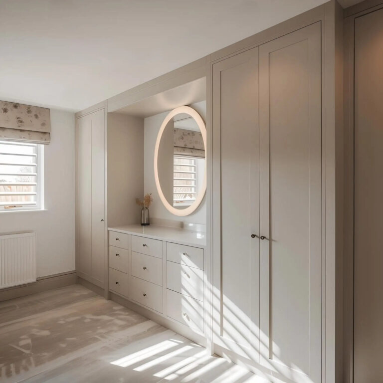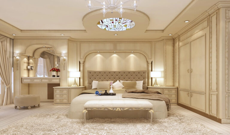 Luxury wardrobes from AIA Infratech may incorporate built-in lighting, adjustable shelves, and spacious drawers, combining functionality with visual appeal. Our specially handcrafted wardrobes, adorned with an off-white finish and made from premium wood, embody a minimal design aesthetic that seamlessly blends with interior spaces – a fundamental aspect of our design projects.